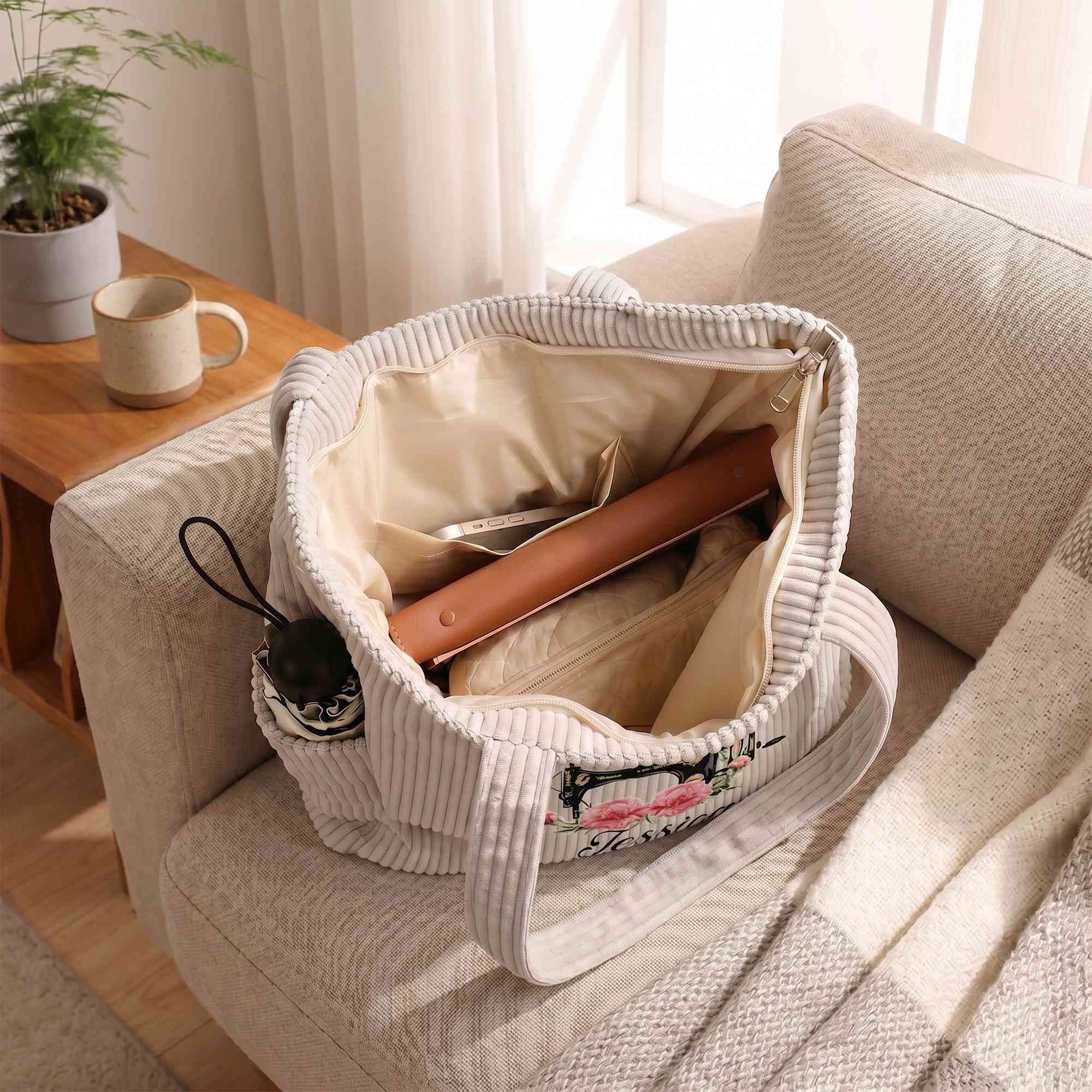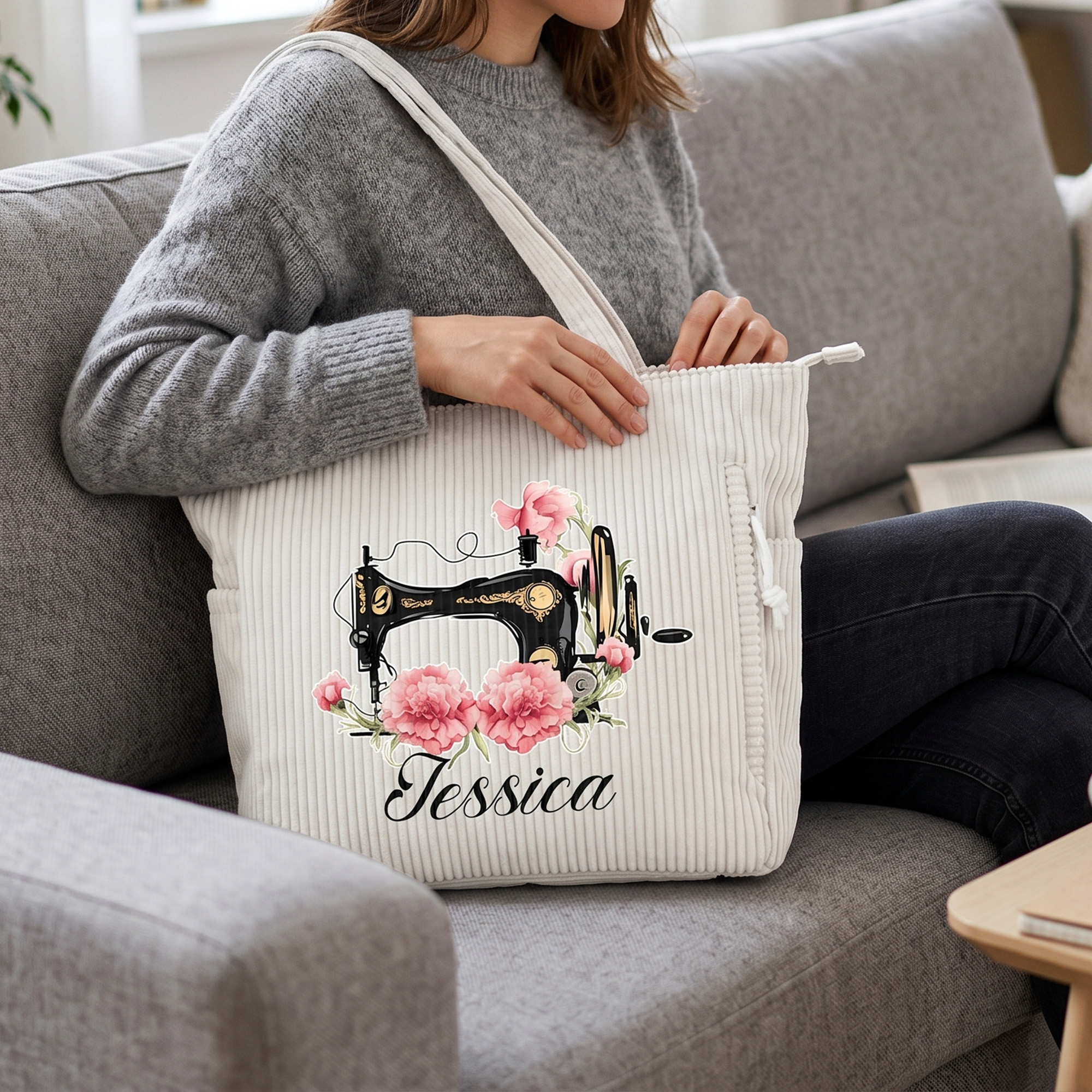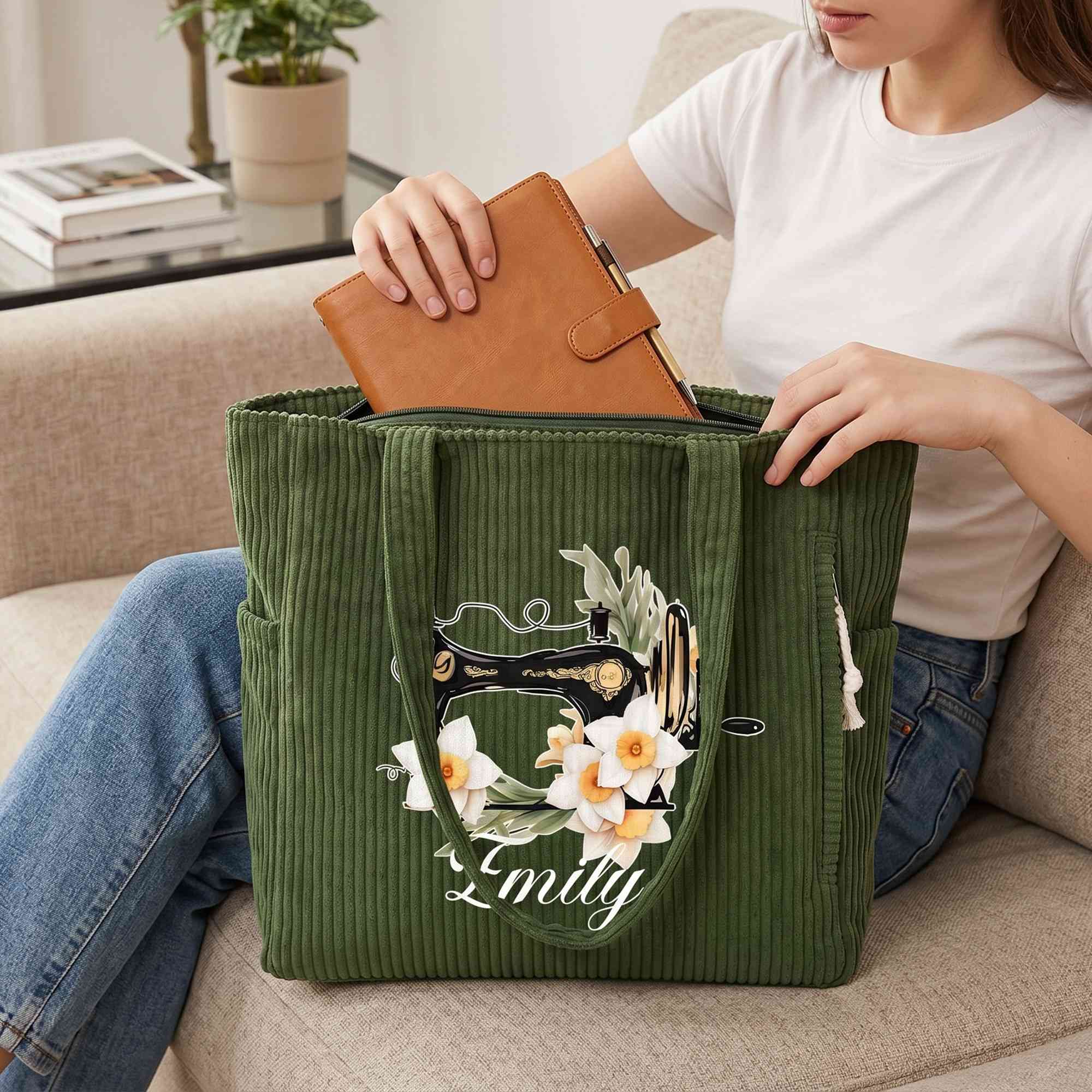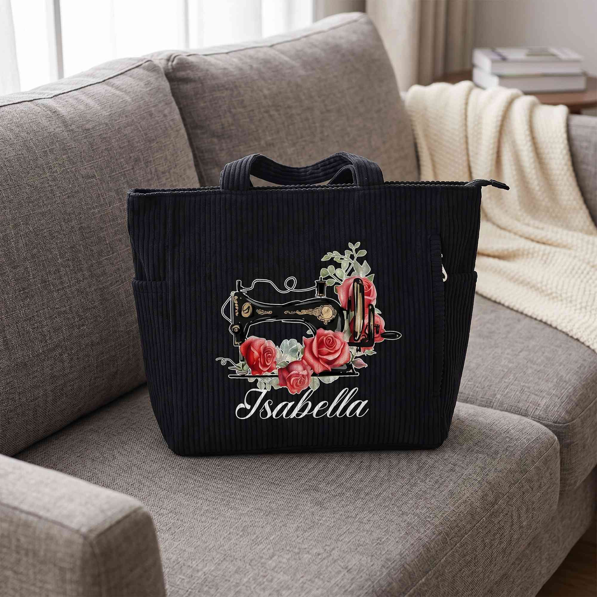 Custom Sewing-Inspired Design - This corduroy tote bag features a lovely sewing machine design paired with birth flower and a custom name, creating a warm and creative look for anyone who loves sewing. The stylish combination of floral details and sewing-themed artwork gives the bag a personal touch while adding charm to everyday outfits.