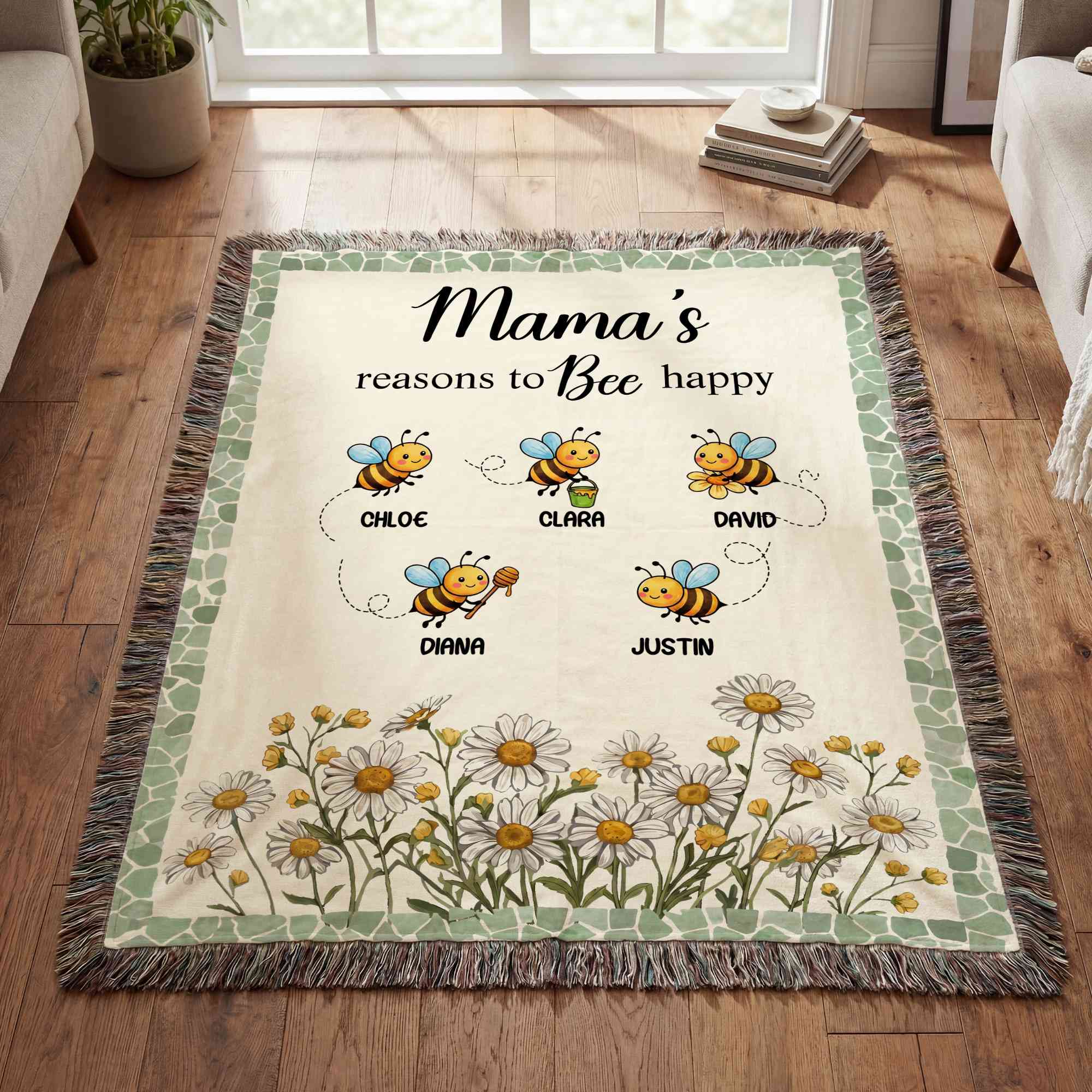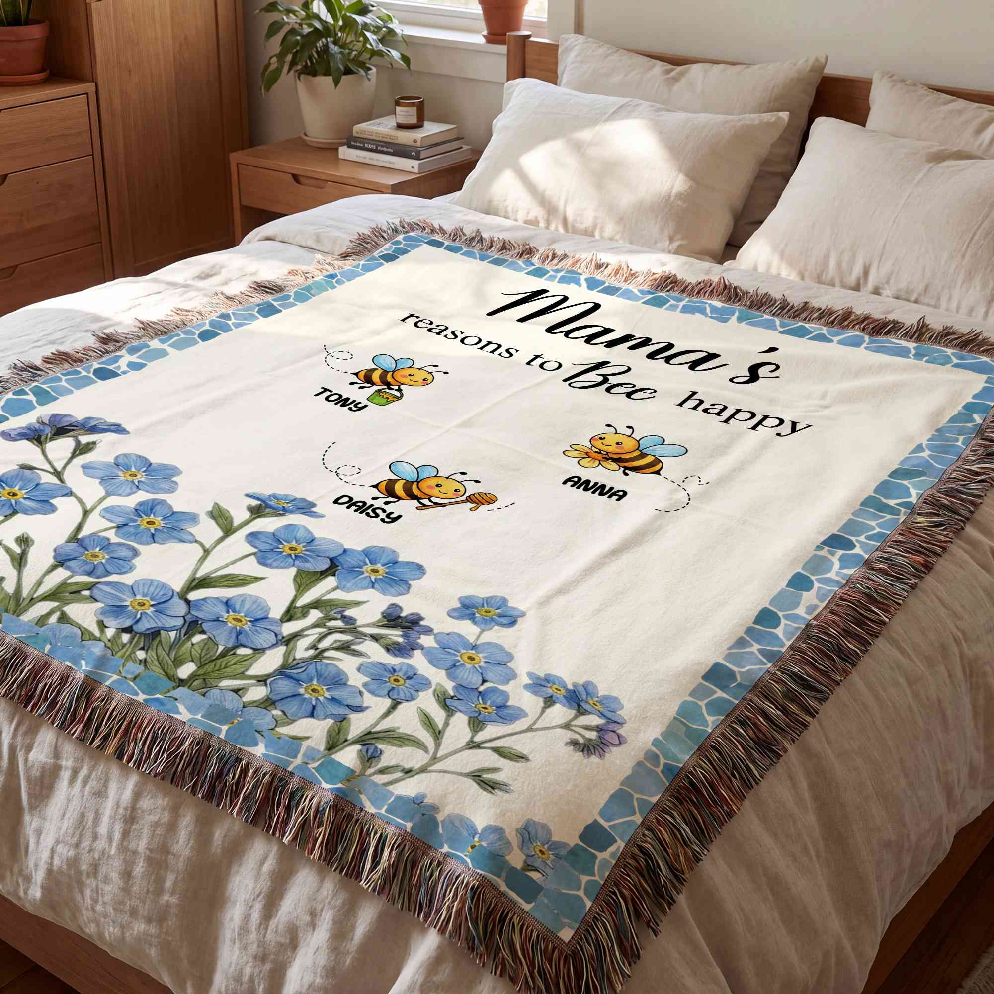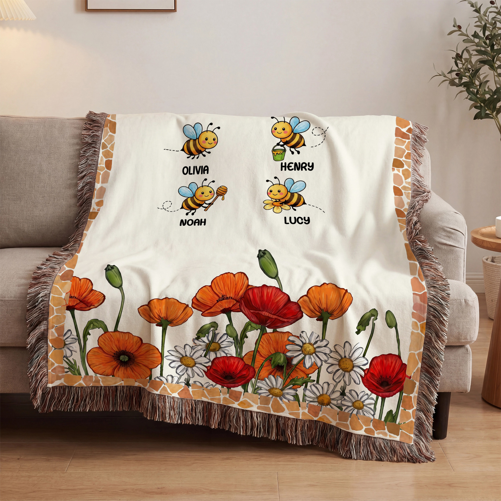 Personalized Names Mama’s Bee Garden Blanket with Tassels, Flannel Bed Couch Throw, Home Decor, Birthday/Mother’s Day Gift for Wife/Mom/Grandma
